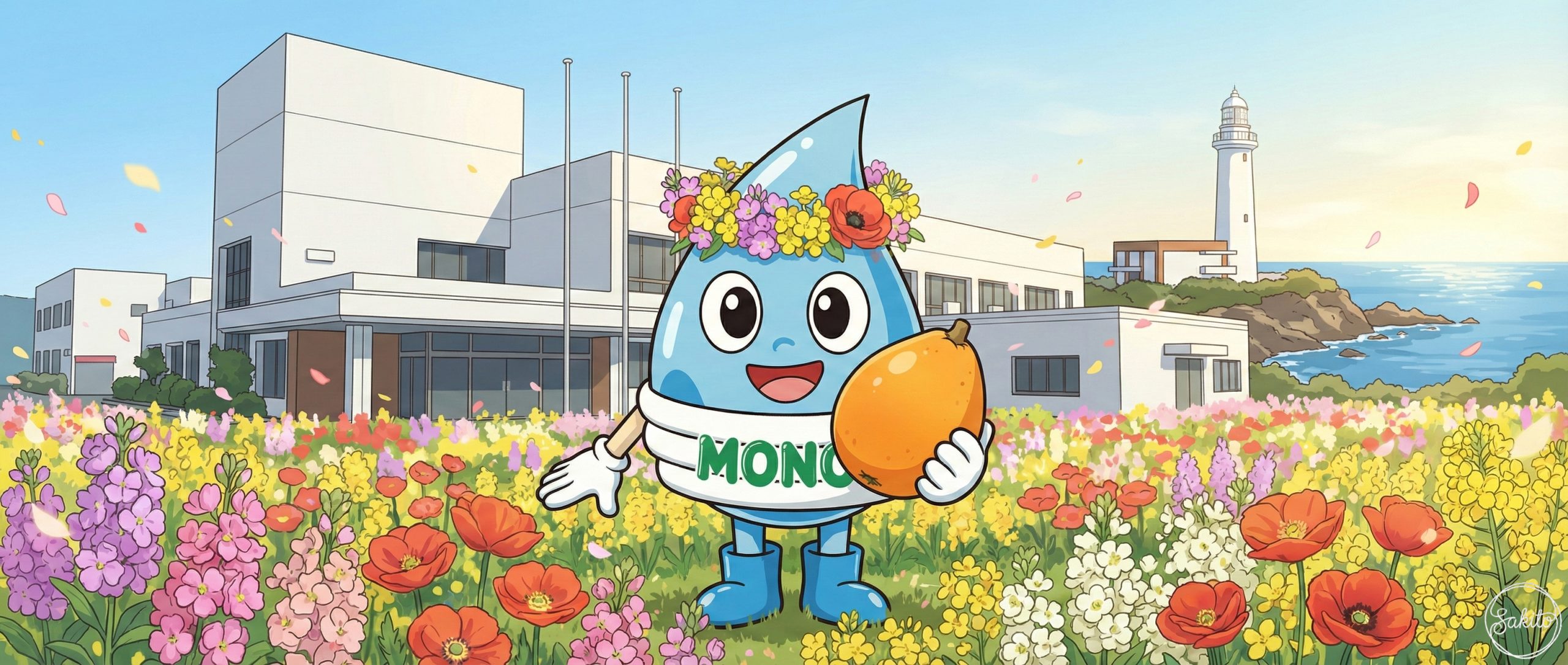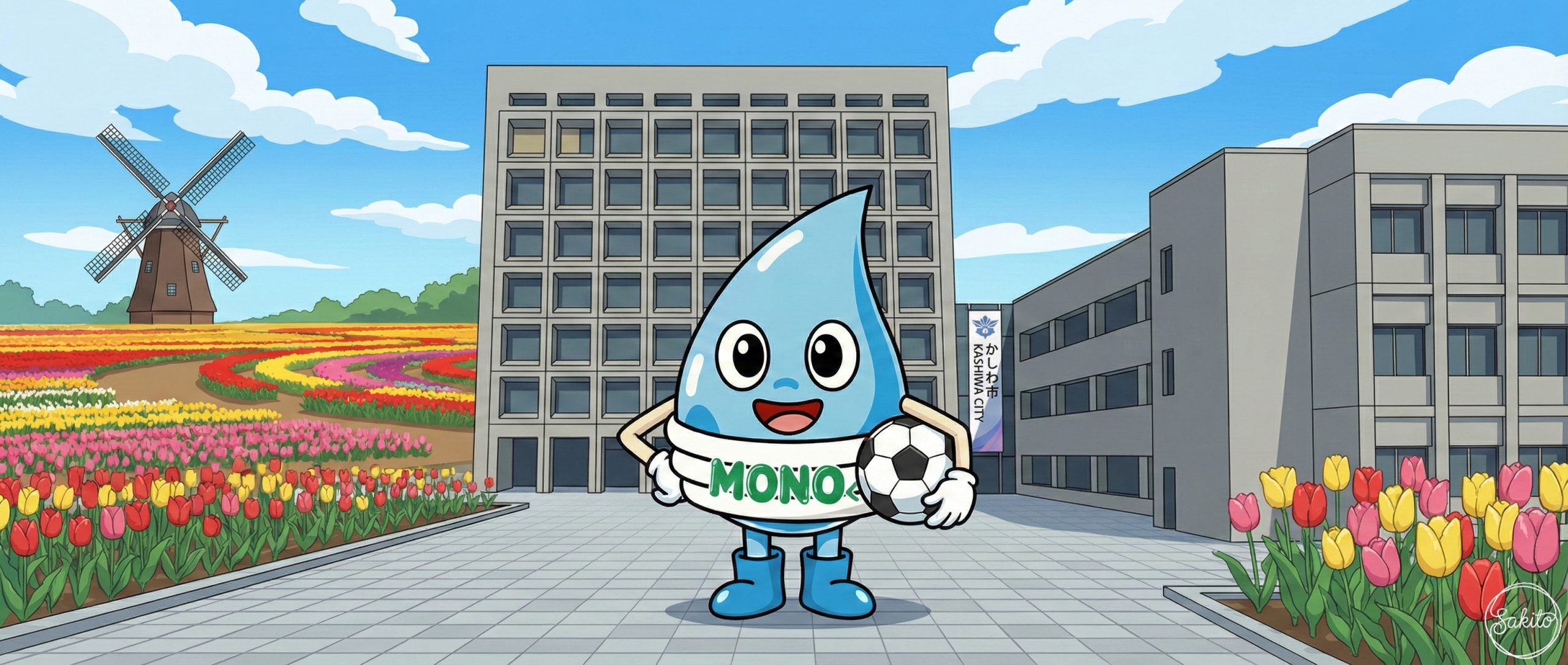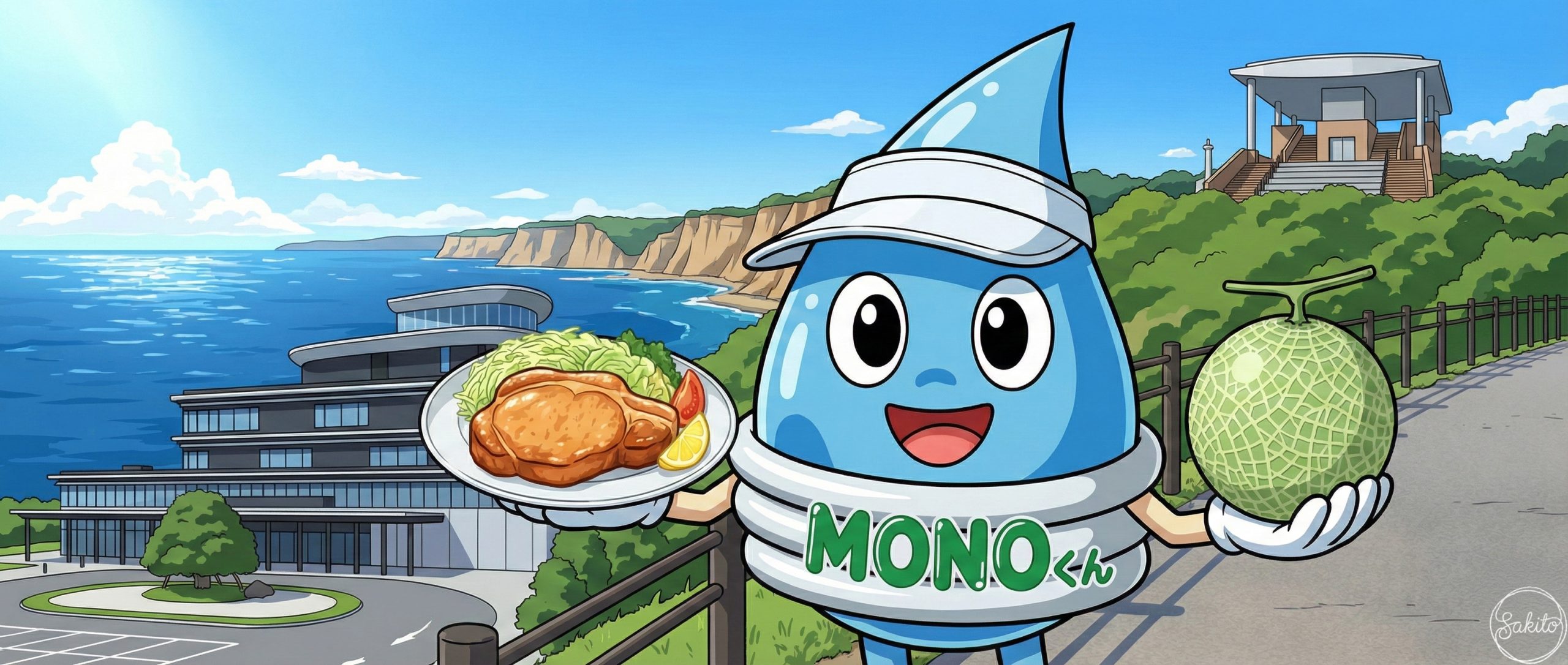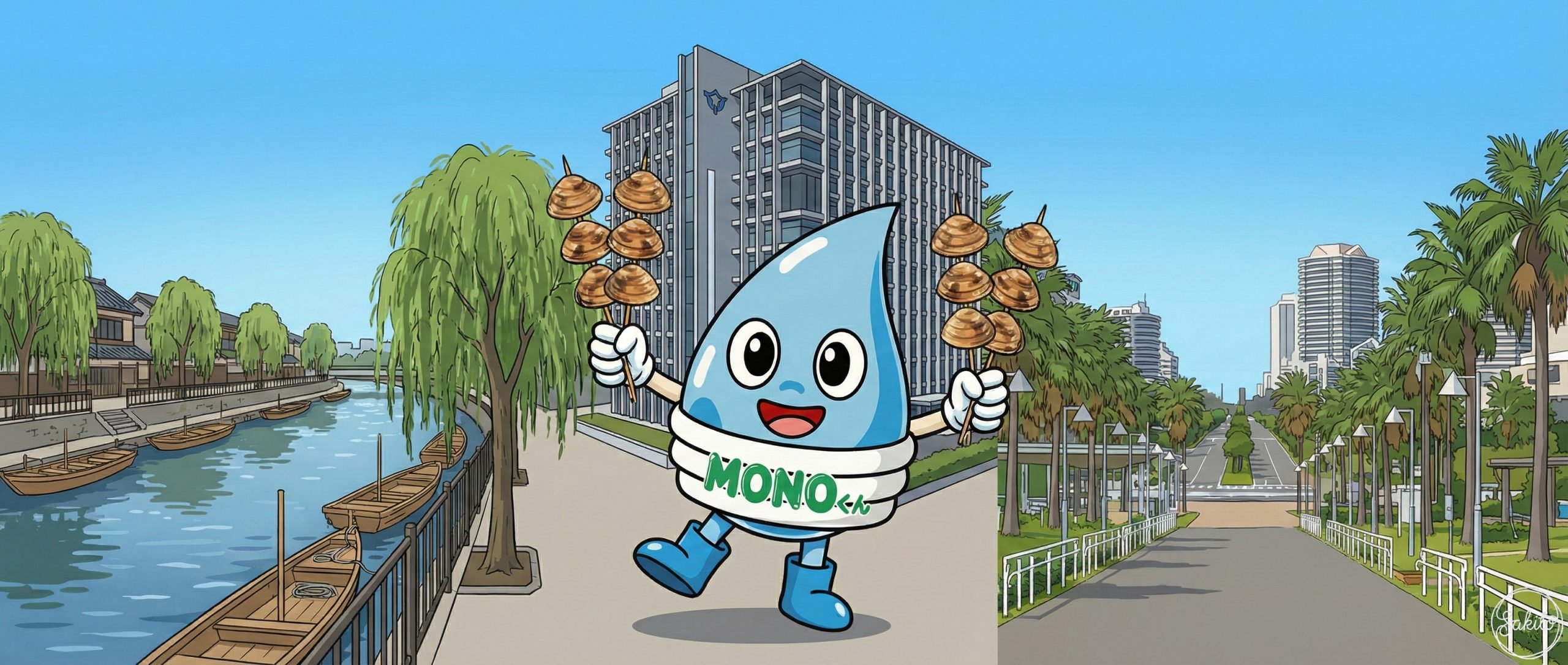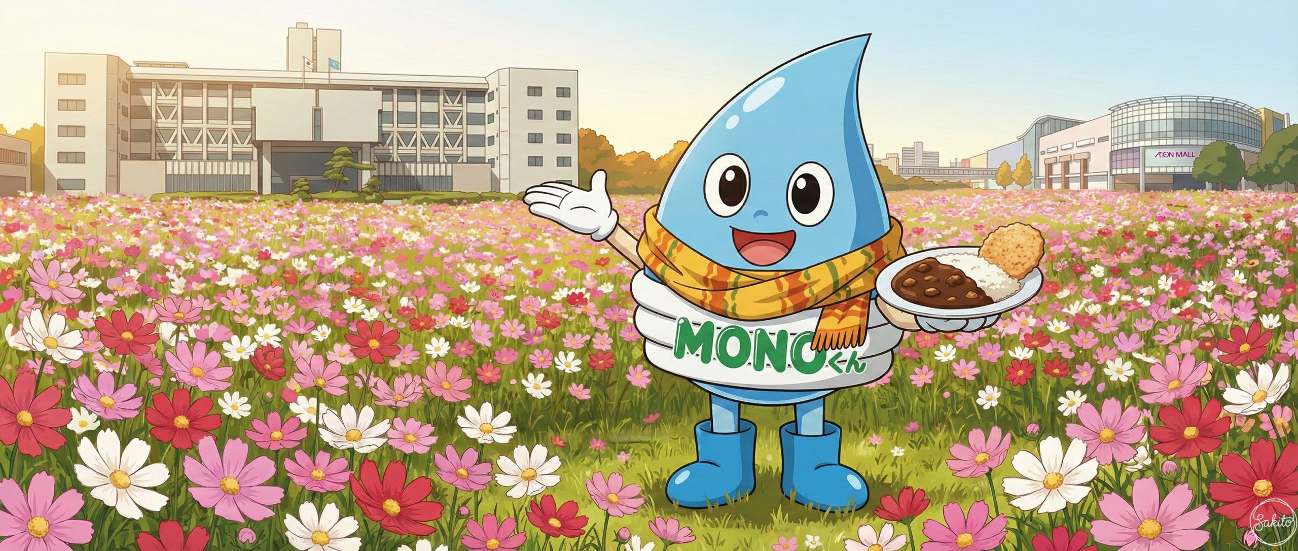広い空と緑が広がる開放的な街。ショッピングも自然散策も一度に楽しめるよ。MONOくんと一緒に、新しい街の魅力を発見してね!