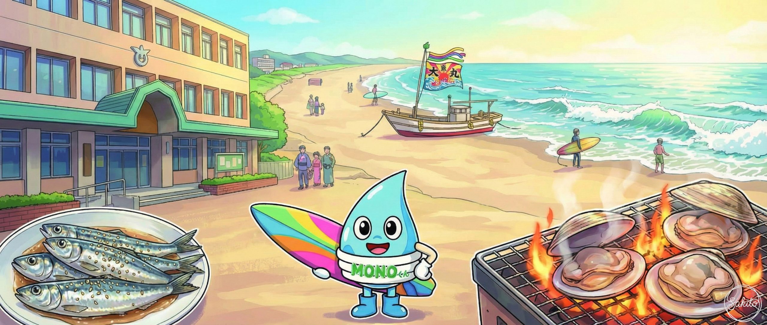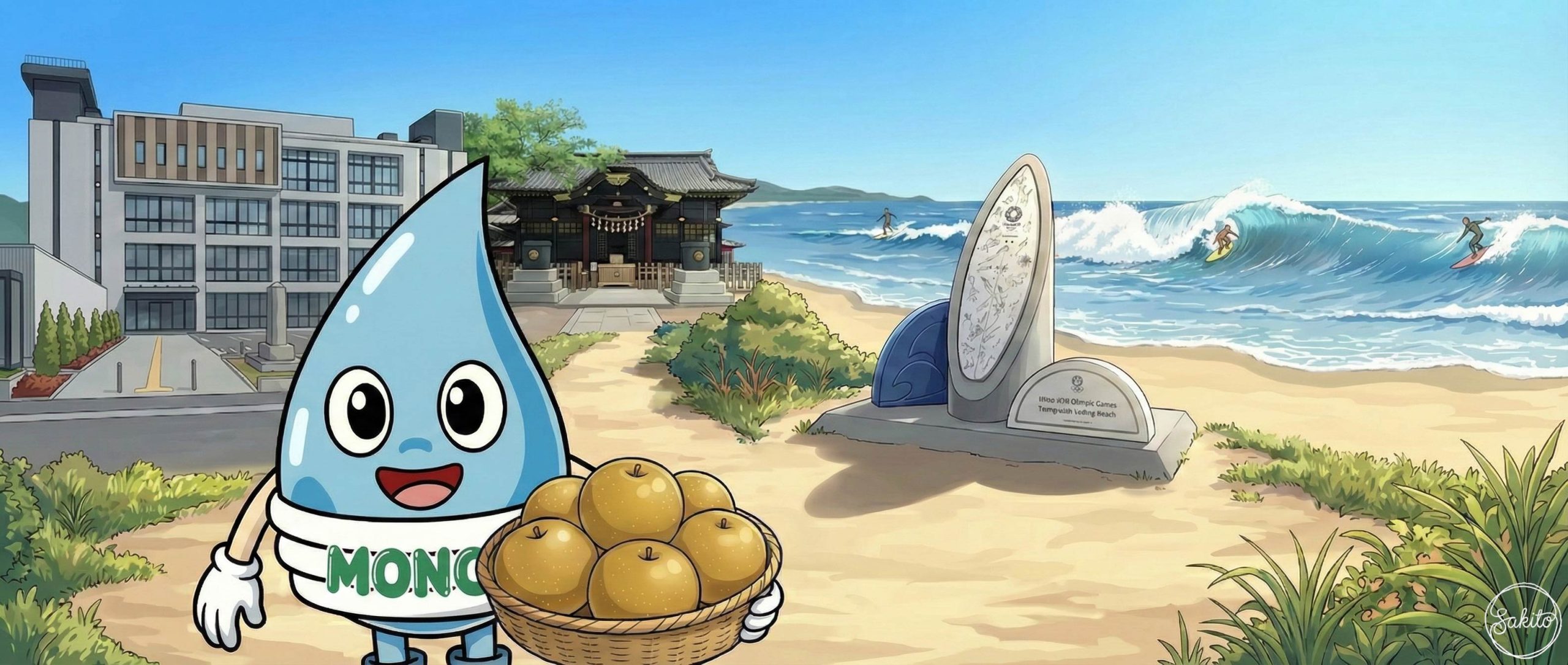 世界中のサーファーが憧れる波が来る街。神社にお参りして、MONOくんとエネルギーを充電!